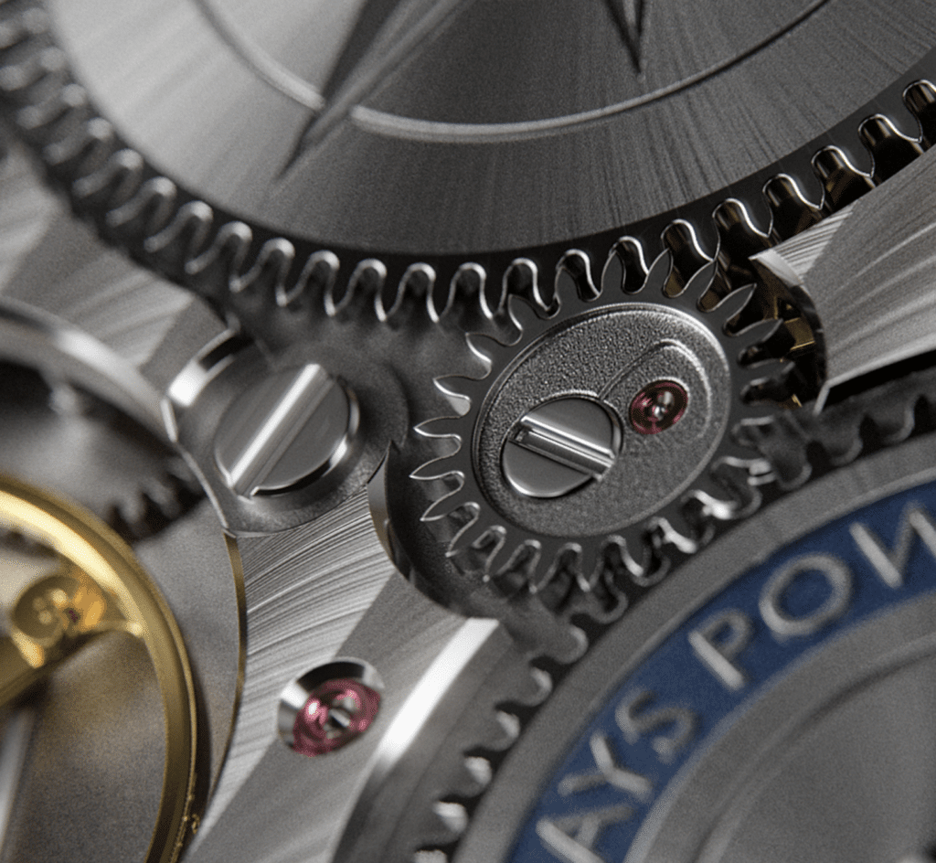 Het meest in het oog springende designelement is de dubbele gangreserve-aanduiding onderaan de wijzerplaat. De linker aanduiding geeft de gangreserve weer van dag 1 tot en met 6. De rechter aanduiding begint met aftellen op de laatste dag van de reserve en toont de resterende 24 uur op overzichtelijke wijze. Ook de retrograde secondewijzer op 12 uur zorgt voor een uitgebalanceerd geheel, zoals geen enkel ander merk dat realiseert.