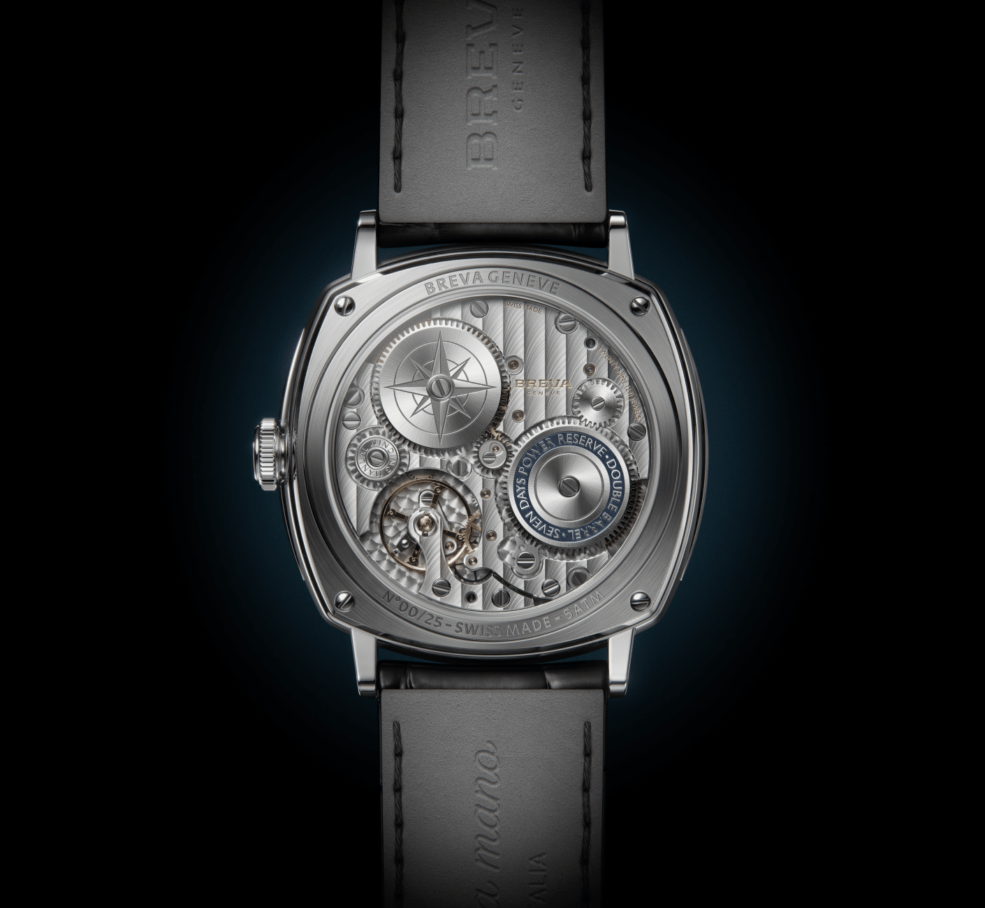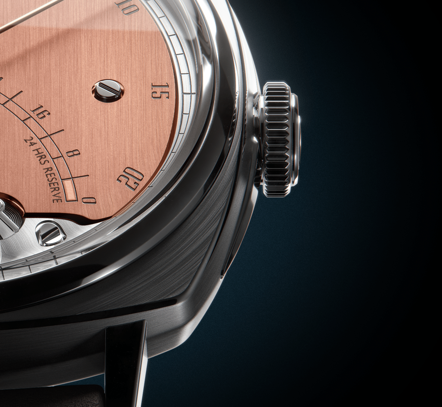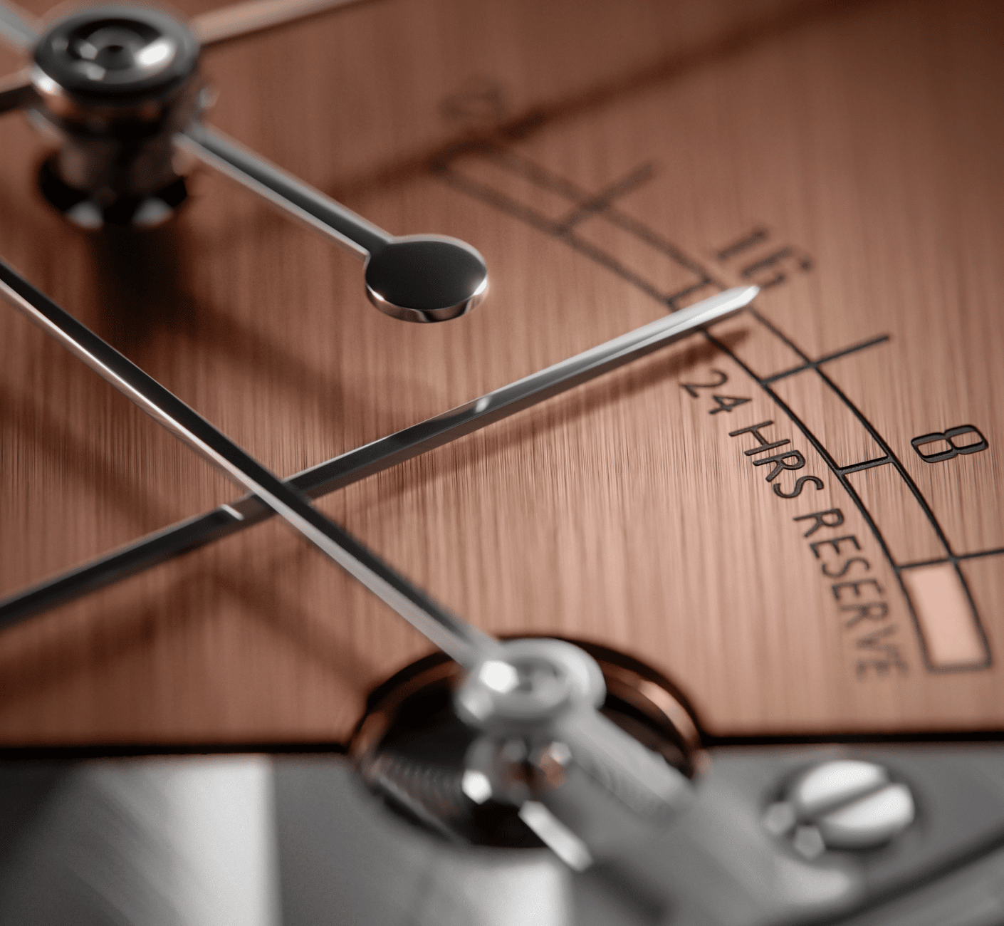 Het meest in het oog springende designelement is de dubbele gangreserve-aanduiding onderaan de wijzerplaat. De linker aanduiding geeft de gangreserve weer van dag 1 tot en met 6. De rechter aanduiding begint met aftellen op de laatste dag van de reserve en toont de resterende 24 uur op overzichtelijke wijze. Ook de retrograde secondewijzer op 12 uur zorgt voor een uitgebalanceerd geheel, zoals geen enkel ander merk dat realiseert.