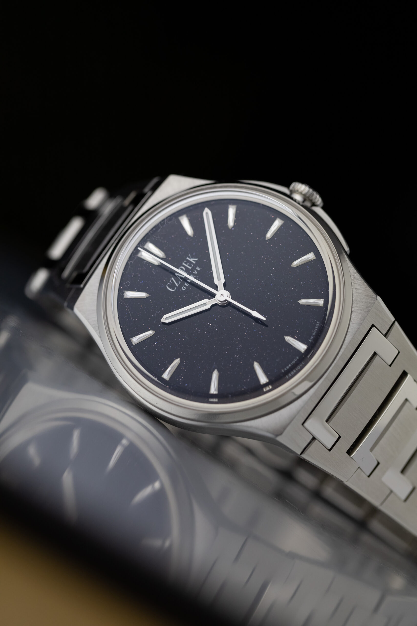 Het sportief chique model Antarctique is in dit model uitgevoerd met een wijzerplaat van aventurijnglas, de indexen zijn gemaakt van diamant met een unieke slijpvorm.